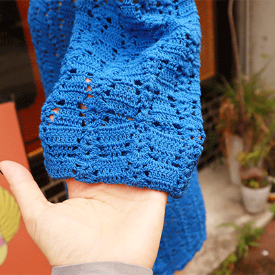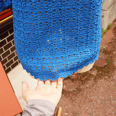 編み目は細かい穴がポコポコ開いているような編み目です。下に合わせる柄シャツのインパクトを抑えてくれたり、無地で合わせると編み目が分かりやすくてさし色にも♪