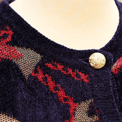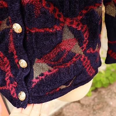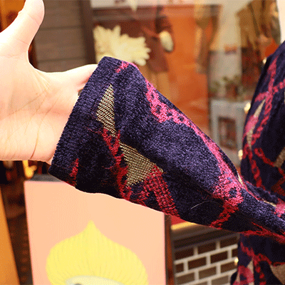 全体的には落ち着いたカラーですが、金ラメ糸が織り込まれてるので光の当たり具合でキラリとする華やかなカーディガンです。